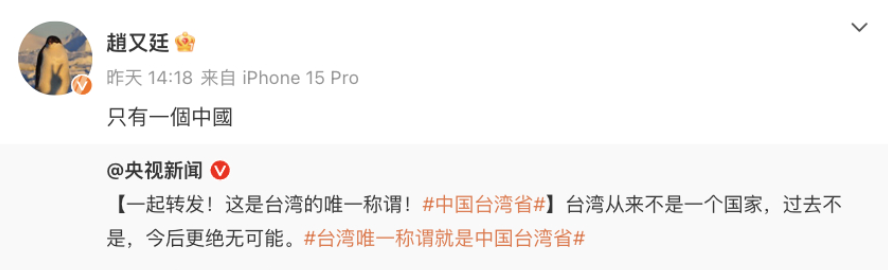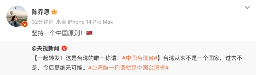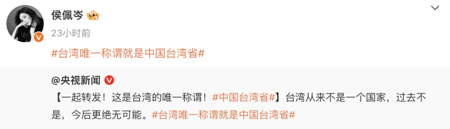 侯佩岑、赵又廷、张韶涵……众台湾艺人转发“台湾必归”海报