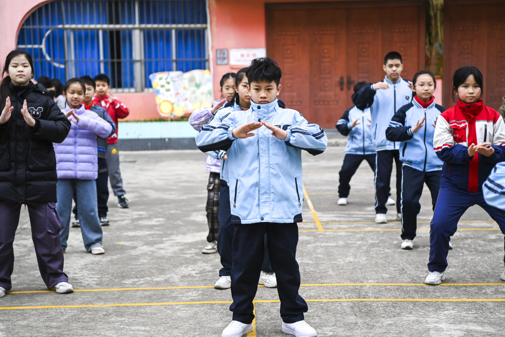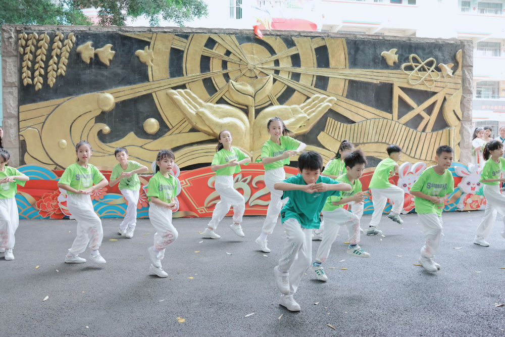 符隽熙(中)与老师、同学在学校内排练舞蹈。