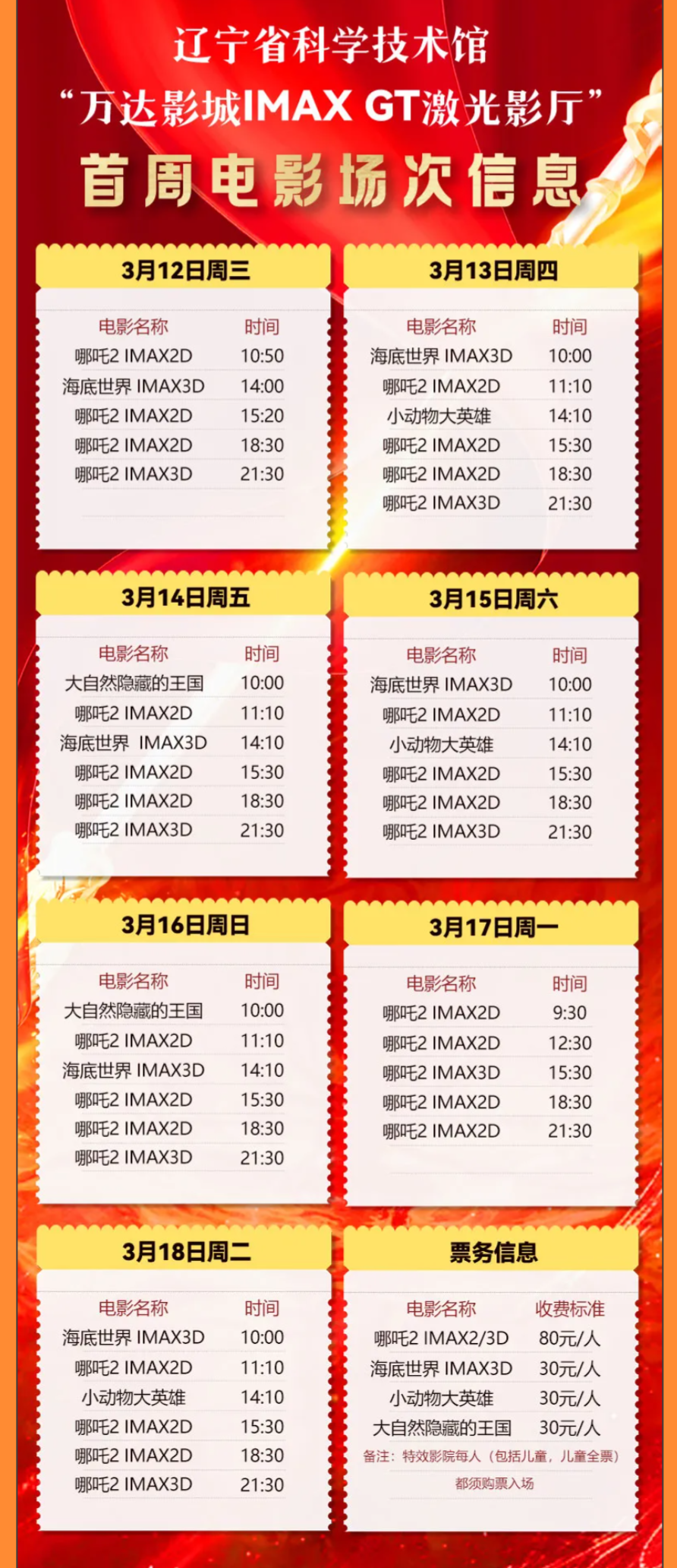 根据辽宁省科技馆此前预告,该馆“万达影城IMAX GT激光影厅”《哪吒2》于3月11日上午10:00开启预售。首周场次信息显示,3月12日至16日,辽宁省科技馆每天将放映4场IMAX 2D版本《哪吒2》,17日将放映5场,18日将放映4场,票价80元。