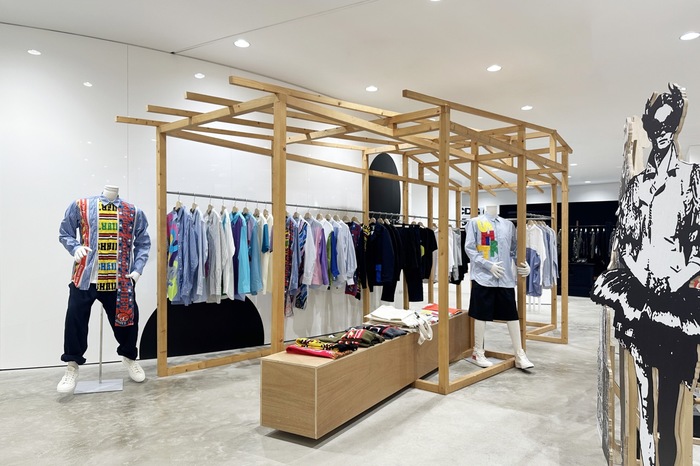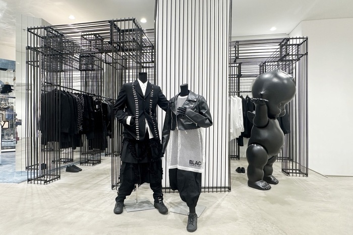 一层 Elephant Space 呈现川久保玲亲自设计的特别装置“小而宏大”,通过木质框架与几何结构营造戏剧化氛围。二层引入 Phoebe Philo 的 Collection C,以雕塑式廓形与羊毛、皮革等材质展现冷静力量感。Jan Jan Van Essche 区域则展出曾在安特卫普 Momu Museum 亮相的人台作品,由艺术家 Rune Tuerlinckx 用回收木椅和钢杆等材料手工打造,呈现衣物“仍在行走”的姿态,为观者留下想象空间Simone Rocha 以“龟兔赛跑”为灵感,将复古细节与运动元素结合,讲述耐心与风格的故事。B1 层 BAPE® GALLERY™ 展出印尼艺术家 Arkiv Vilmansa 的巨型雕塑《DOMMA | APE HEAD》,为街头氛围增添亮点。