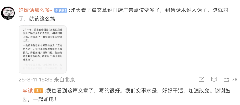 日前有消息称,一名即将离职的蔚来员工在内部论坛发布长文提出十条建议,呼吁公司应尽快从务虚转化为务实,以市场为导向。几小时后,蔚来CEO李斌在评论区实名回复,“谢谢大家的建议,提升全员经营意识,从我自己做起。”随后,这篇长文不仅在热门区置顶,还通过飞书推送给了全员。