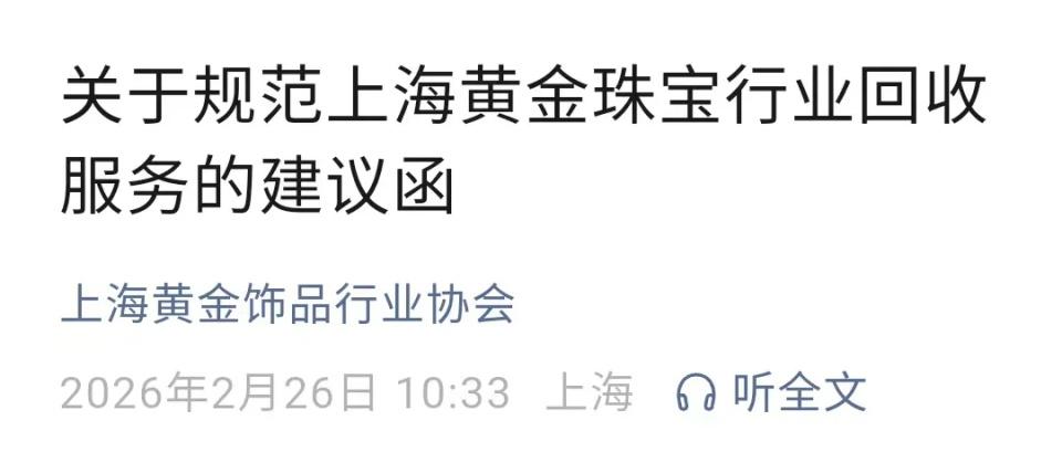 今天(2月26日),上海黄金饰品行业协会发布关于规范上海黄金珠宝行业回收服务的建议函。各黄金珠宝企业...