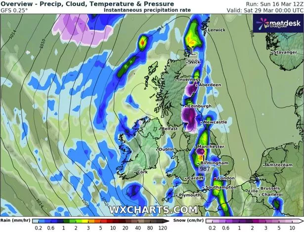 根据最新预报,英国多个地区可能很快就会遭遇暴风雪。WXCharts的天气图显示,3月29日(星期六)...