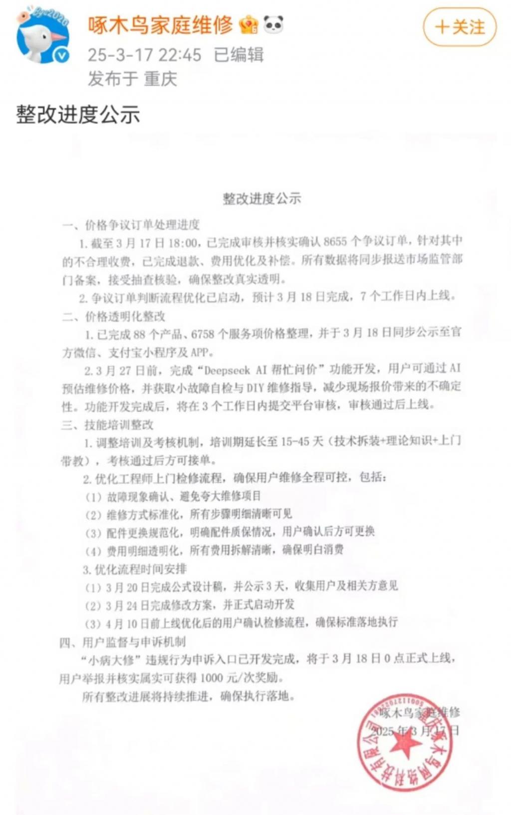 3月17日,啄木鸟家庭维修发布整改进度公示:截至3月17日18:00,已完成审核并核实确认8655个...