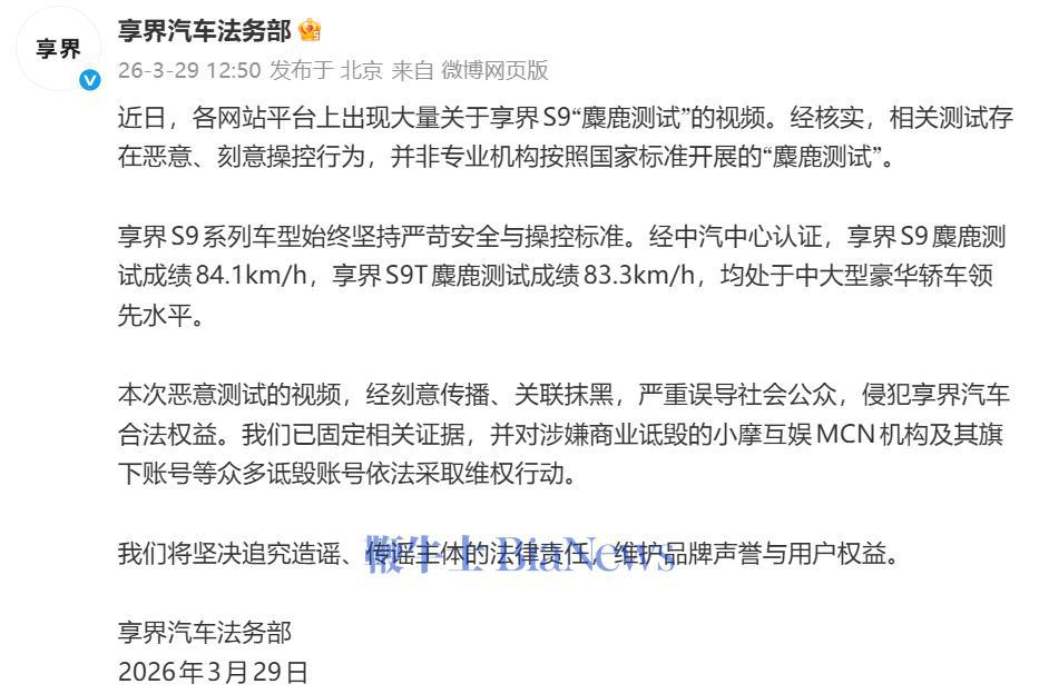 享界汽车法务部:网传S9麋鹿测试视频存在恶意操控行为,已起诉小摩互娱学习