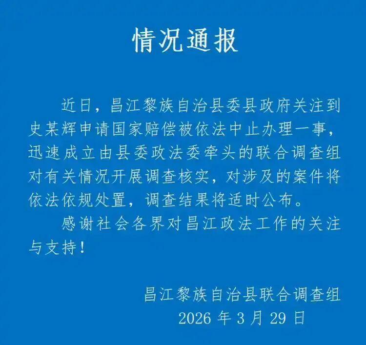 海南昌江通报“史某辉申请国家赔偿被依法中止办理”:开展调查核实学习