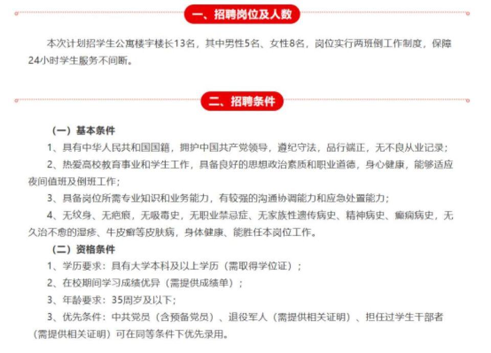 近日,一则西北师范大学招聘学生公寓楼长的公告引发关注。该岗位要求应聘者具有大学本科及以上学历,年龄在...