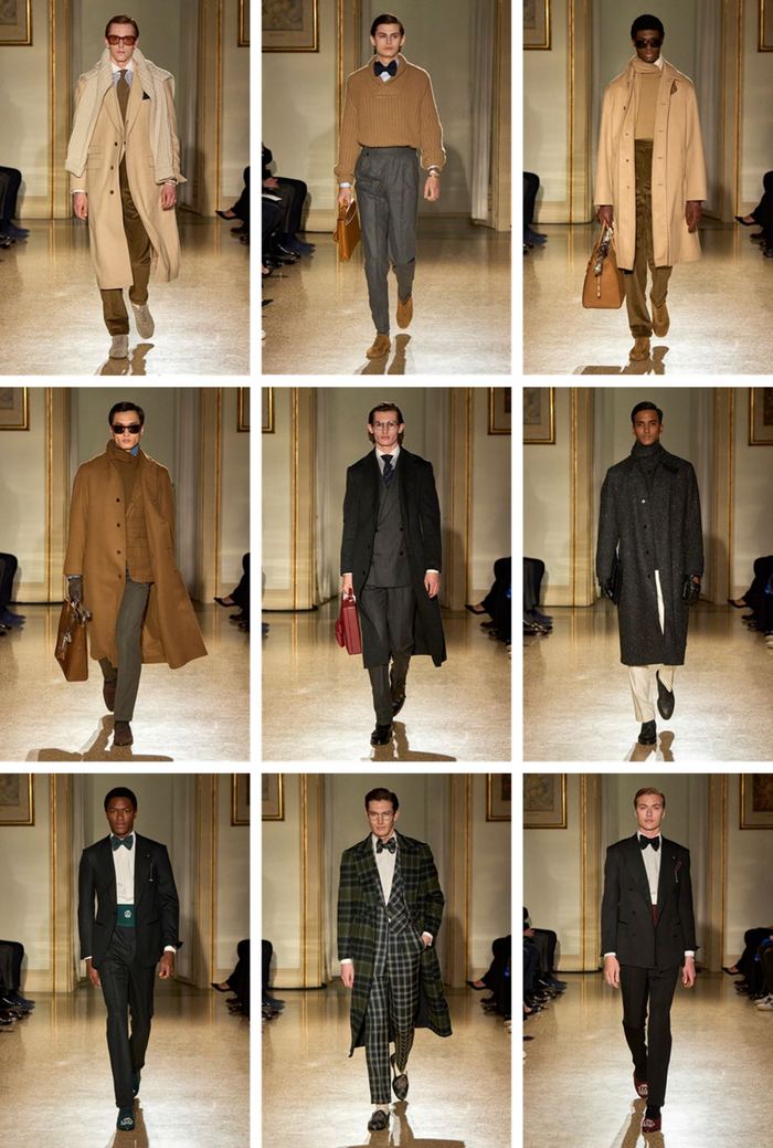 系列以不同层次的驼绒面料开篇,涵盖单面与双面外套,搭配运动夹克与灯芯绒长裤,展现潇洒而不失严谨的英伦气质。深海蓝麦尔顿呢外套与大衣点缀抛光黄铜纽扣,呼应军装元素。粉笔条纹西装、汽车大衣及绒面皮革夹克等款式,则在传统剪裁中注入现代演绎。