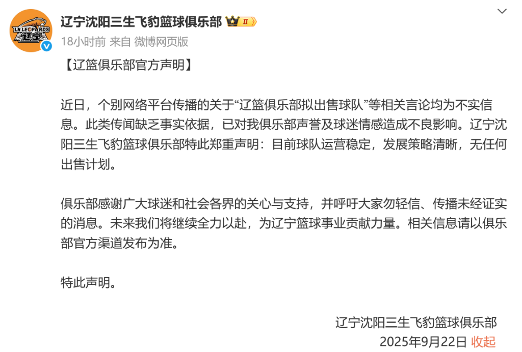 辽宁男篮俱乐部官方发布声明:“近日,个别网络平台传播的关于‘辽篮俱乐部拟出售球队’等相关言论均为不实信息。此类传闻缺乏事实依据,已对我俱乐部声誉及球迷情感造成不良影响。辽宁沈阳三生飞豹篮球俱乐部特此郑重声明:目前球队运营稳定,发展策略清晰,无任何出售计划。”
