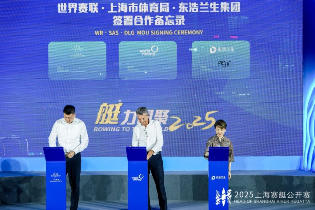 世界赛艇联合会执行主任盖拉德、上海市体育局副局长罗文桦与东浩兰生(集团)有限公司副总裁周瑾签署合作备忘录。