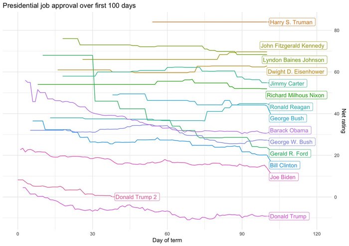 据美国知名民调网站538的数据,截至美国东部时间周二下午1点,47.8%的美国人认可特朗普担任总统的工作,而47.7%的美国人不认可。上任不足百日,特朗普的净支持率已跌至0附近。