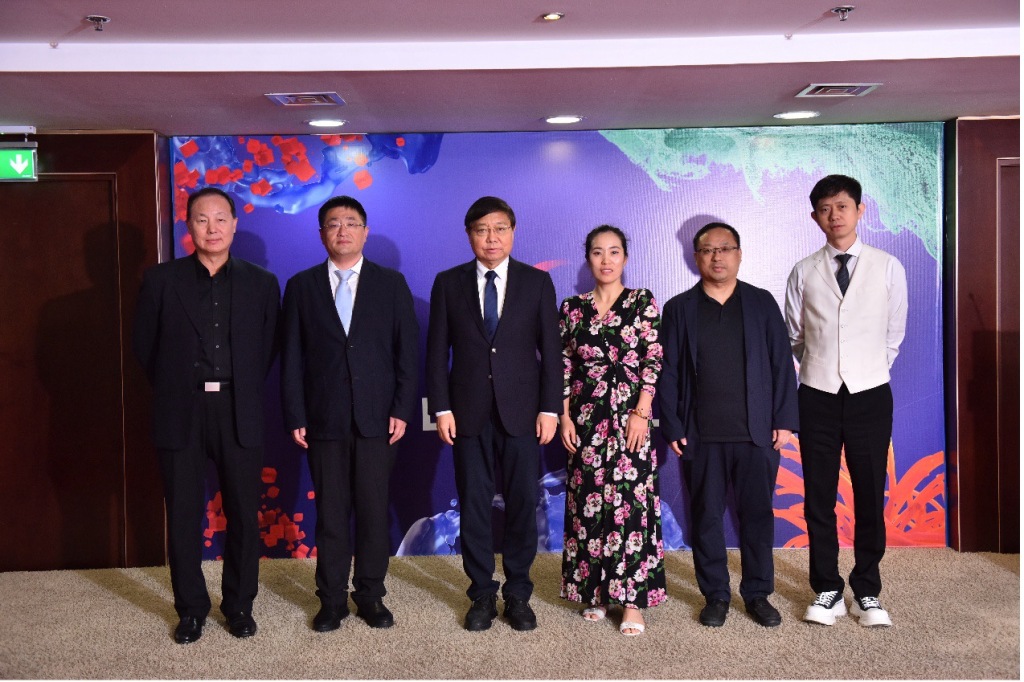 中国广告协会国际传播工作委员会执行主任陆文龙做“鲲鹏出海生态圈”说明,并与嘉宾共同启动“鲲鹏出海生态圈 迪拜全球发布”(左起:媒捷中国总裁赵子谦,中建中东副总马文龙,中国广告协会会长张国华,央广时代董事长张娜,中广协国传委执行主任陆文龙,新意互动总裁杨涛)