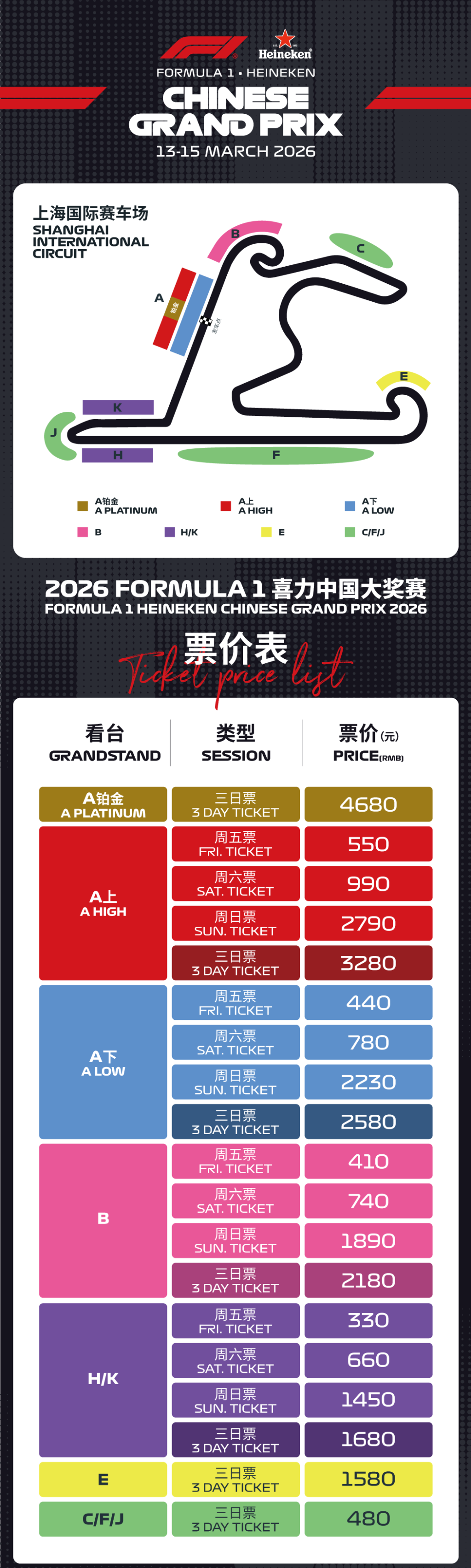 为了进一步加大市场供给,2026F1喜力中国大奖赛在现有观赛资源的基础上持续深挖,打造出了结构更丰富、场景更多样的票务产品体系。