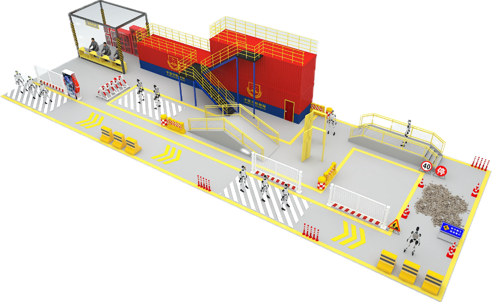 我们在张江科学会堂内搭建了一个全拟真的应急救援竞赛现场。参赛的具身智能机器人,必须在 10m × 30m 的极限赛道中,按固定动线完成一系列对应现实应急救援关键步骤的高难度任务: