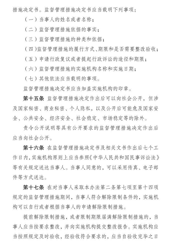 四是明确监管措施决定的作出及执行要求。包括监管措施决定书应当载明的事项、公开要求、送达程序等。