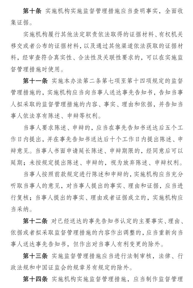 二是明确监管措施的实施原则。实施监管措施,应当遵循依法、效率、公正原则,应当符合法律、行政法规、中国证监会规章规定的程序,应当及时矫正违法行为,防范风险蔓延与危害后果扩散,坚持风险防控与教育相结合,应当以事实为依据,与行为的性质、情节、危害程度以及风险大小相当。