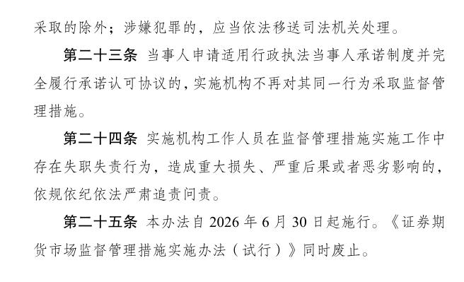 据证监会发布 12 月 31 日消息,为贯彻党的二十大和二十届二中、三中、四中全会及中央金融工作会议、中央全面依法治国工作会议精神,落实法治政府建设相关要求,进一步规范证券期货市场监督管理措施(以下简称监管措施)的实施程序,中国证监会制定了《证券期货市场监督管理措施实施办法》(以下简称《实施办法》),自 2026 年 6 月 30 日起施行。