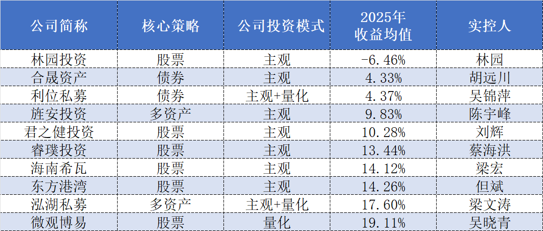 (按公司平均收益排名,符合统计的私募:至少有3只产品与私募排排网有代销关系,有2025年的业绩显示且符合排名规则。)