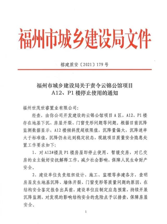 福州市城乡建设局对该项目发出了责令停止使用的通知。通知显示,A 区的 A12、P1 楼存在地基下沉、房屋开裂、门窗变形问题,A12 楼倾斜度超极限值,沉降量偏大,沉降速率大于标准值,沉降未达到稳定状态。