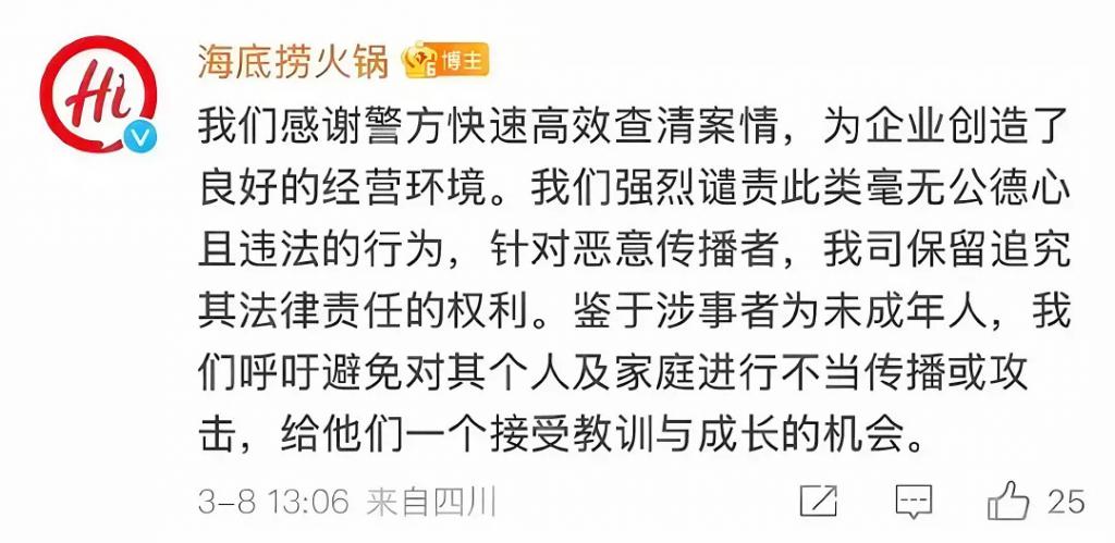 但事关未成年人,海底捞没有第一时间锚定受害者的身份,而是针对始作俑者,采取了原谅的态度,表示要给他们一个接受教训与成长的机会,并且还呼吁大家避免对其个人及家庭进行不当传播或攻击,并强调谴责并追究 " 恶意传播者 " 的责任。