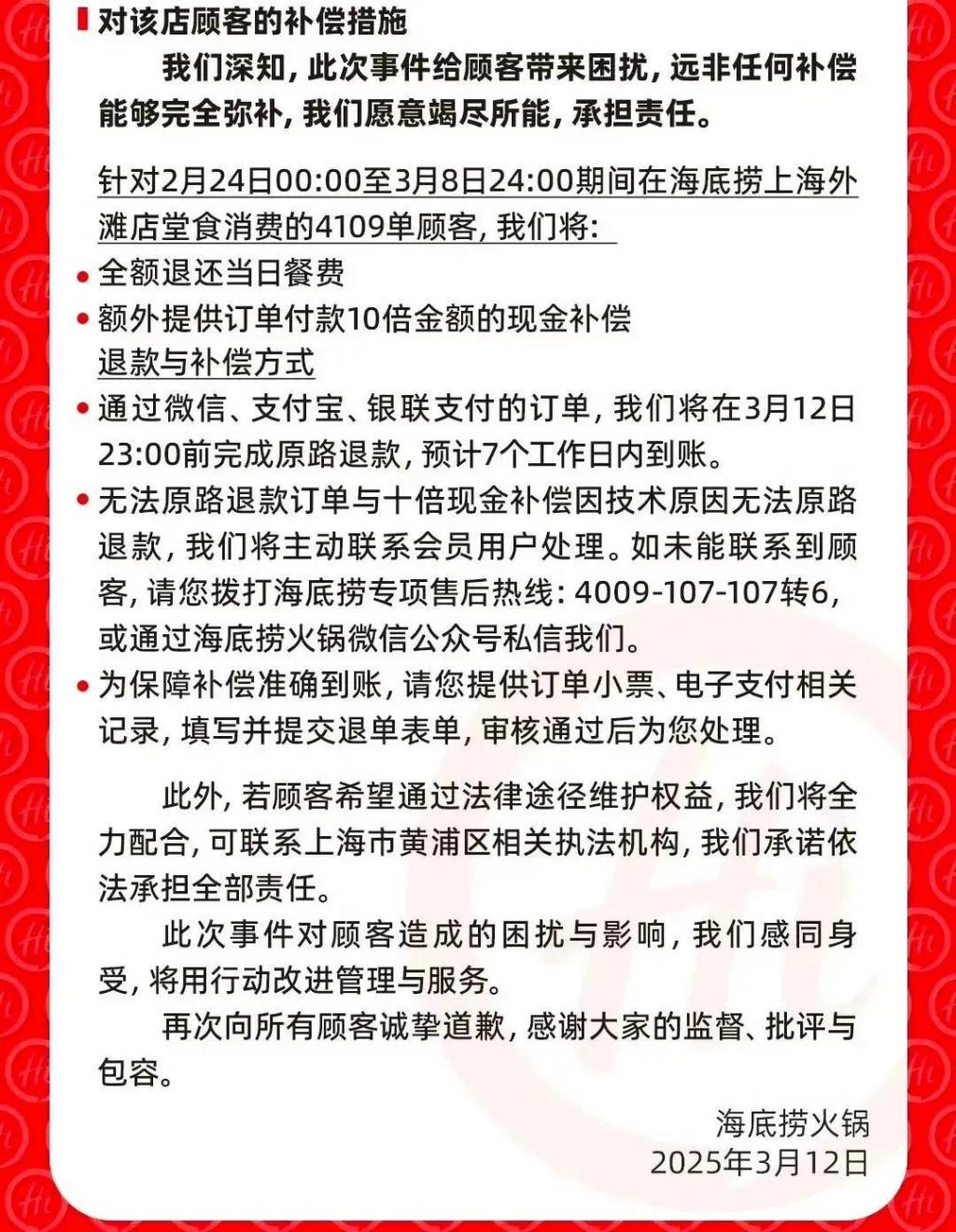 为了进一步挽回声誉,海底捞只能狠下心来花钱解决问题——针对 2 月 24 日 00:00 至 3 月 8 日 24:00 期间在海底捞上海外滩店堂食消费的 4109 单顾客,海底捞将全额退还当日餐费,并额外提供订单付款 10 倍金额的现金补偿。