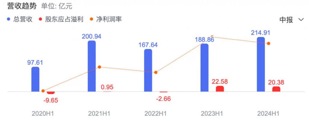 海底捞 2024 年中期财报显示,总营收为 214.91 亿元 / 图源:百度股市通