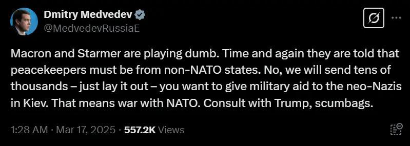 然而,梅德韦杰夫的回应也达到强烈的最高级。他痛斥马克龙和斯塔默是 " 在装傻 ",因为他们已被告知多次,维和人员必须来自非北约国家。" 直说吧,你们就是想向基辅的‘新纳粹分子’提供军事援助。" 梅德韦杰夫写道," 这意味着与北约开战。去问问美国总统特朗普吧,你们这些卑鄙小人。"