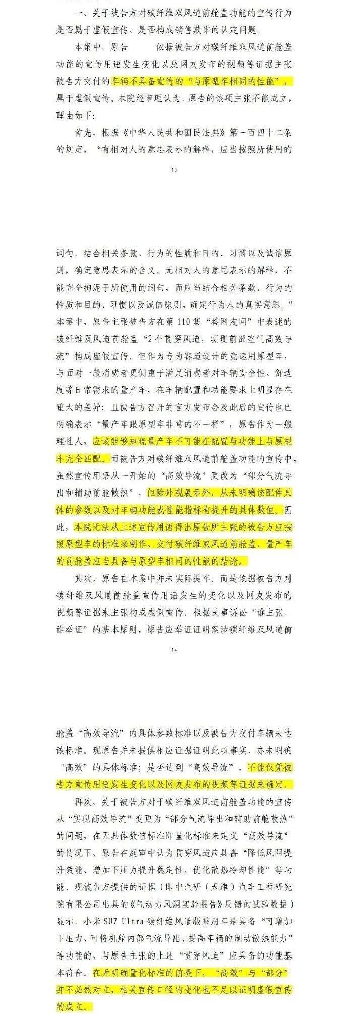 法院进一步指出,原告并未实际提车,依据 " 谁主张、谁举证 " 的基本原则,原告并未提供涉案碳纤维双风道前舱盖 " 高效导流 " 的具体参数标准及交付车辆未达到该标准的事实,不能仅根据被告方宣传用语发生变化以及网友发布的视频等证据来证明。