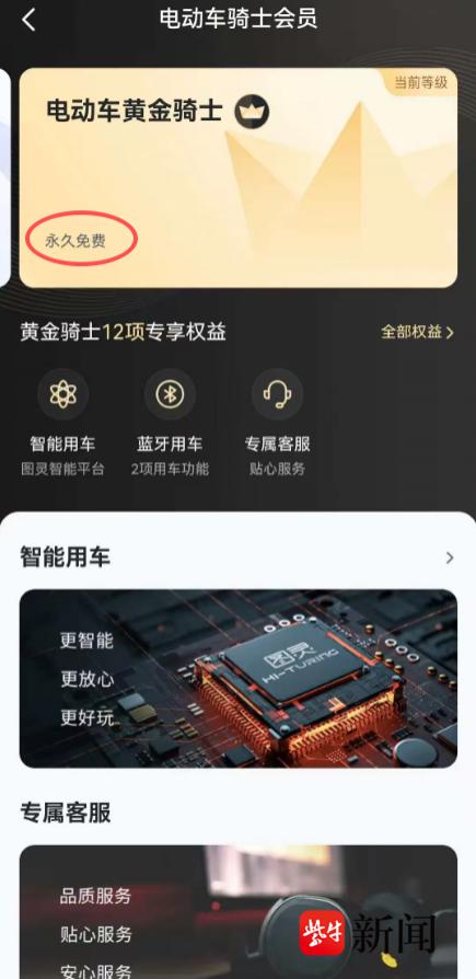 宁先生向记者展示了他购买的该款智能电动车,如今的它只剩下了蓝牙功能。宁先生介绍,这辆车购买于 2021 年,是在当地的专卖店购买的," 当时的店员着重介绍了它的智能远程开锁、车辆定位、行程记录的功能,且是长久免费的。我后来去 APP 的宣传页专门核实了一下,也看到了购买此车就拥有了黄金会员,可终身免费的宣传语,还截图了。" 宁先生表示,这辆电动车 4000 多元,不算便宜,就是冲着这些功能购买的。