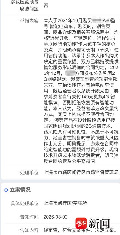 河北的宁先生最近遇到了一件烦心事,他于 2021 年花 4199 元购买了一辆某知名品牌 A80 型号的智能电动车,该车的销售页面显示其有 " 远程开锁、车辆定位、行程记录等智能功能 ",且终身免费使用。然而,去年底,宁先生发现车子的一系列智能功能均被停用了,品牌方表示系统升级,消费者需支付 149 元更换 4G 模块后,智能功能才能恢复。这让宁先生感到很不愉快," 明明购买时已承诺好,怎么忽然变卦了?" 紫牛新闻记者调查了解到,此事并非个例,百余名消费者都遇到了 " 升级收费 " 的问题,还有人投诉至上海市 12345。3 月 9 日,相关部门表示已决定立案。