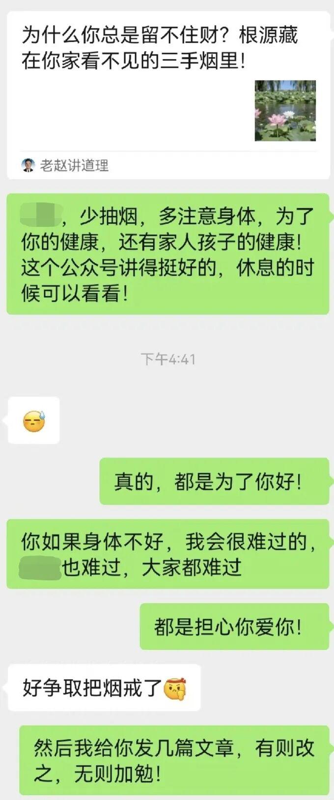 秋秋也把老赵的文章发到了家庭群,她今年 21 岁,上大学后,她开始抗争爸爸和叔叔的抽烟行为。秋秋很反感他们在公共场所吸烟,反复劝说,他们偶尔会把烟掐掉。前阵子,她把 " 老赵 " 写的《为什么你总是留不住财?根源藏在你家看不见的三手烟里!》发进群里。这次的效果还不错,叔叔回复:争取把烟戒了。