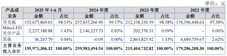 “这个业绩跳涨几乎是在IPO申报前夕‘精准爆发’。”私募机构投资人夏丹向界面新闻记者表示。对于业绩爆发原因,元立光电仅笼统表述为 "下游市场需求增长带动",但未给出具体需求来源和订单支撑。从业务结构看,元立光电主营业务高度依赖导光板产品,2025年1-6月导光板收入占比高达98.53%,Mini-LED 光学产品收入占比仅1.43%,业务结构单一的风险突出。市场需要了解的是,这究竟是车载显示领域的一次性订单释放,还是可持续的、结构性的增长动能。