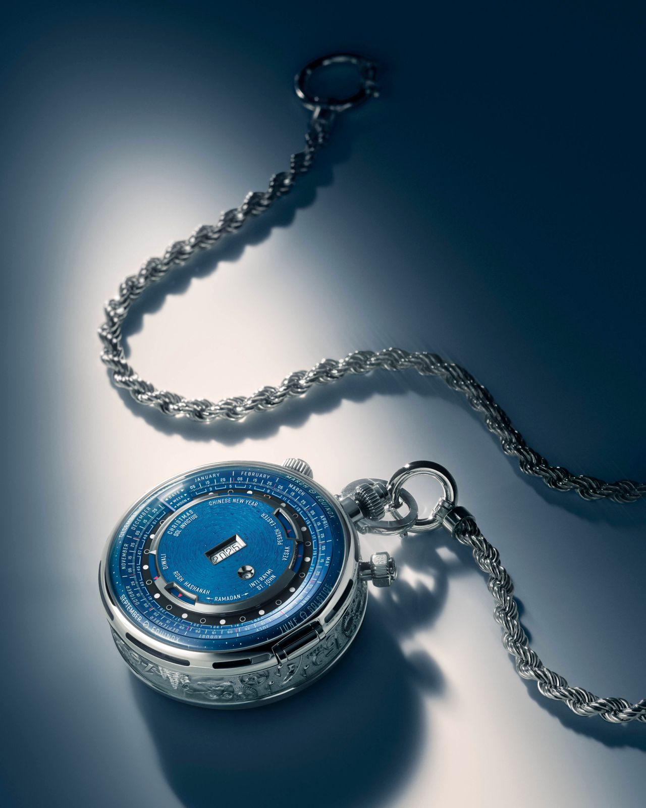 需要提到的是,尽管搭载了数十项复杂功能,但全新150 Heritage怀表使用起来并没有给使用者增加难度。爱彼设计师确保所有历法功能均通过独立视窗显示于该怀表之上,使得各项历法信息和各计时功能副表盘不仅视觉上协调分布,使用者也能清晰读取。