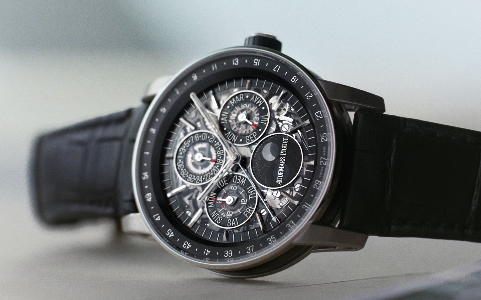 为呈现以上超卓复杂功能,爱彼自助研发了全新Calibre 1150机芯。这一机芯为手动上链机制,由1099个零件组成,驱动包括22项复杂功能在内的40项钟表功能及装置,其中包括大自鸣、三问报时、半格里高利万年历显示、双追针飞返计时和浮动式陀飞轮。