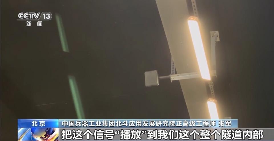 中国兵器工业集团北斗应用发展研究院正高级工程师 张军:我们隧道顶上的天线呢,把这个信号 " 播放 " 到我们整个隧道内部,使我们整个隧道内部充满了北斗信号。