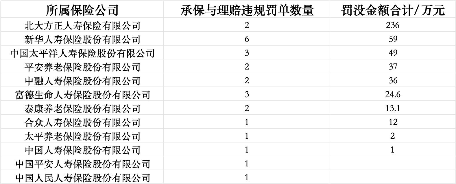 寿险方面,2025年,因承保与理赔违规问题被罚没金额最多的寿险公司为北大方正人寿保险有限公司,罚没金额为236万元;罚单数量最多的为新华人寿保险股份有限公司,共6张。