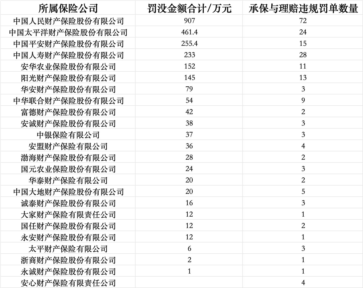具体来看,2025年,因承保与理赔违规问题被罚没金额最多的财险公司为中国人民财产保险股份有限公司,共计被罚没907万元,所收相关罚单数量也最多,达到71张。中国太平洋财产保险股份有限公司紧随其后,2025年因承保与理赔违规问题被罚没461.4万元,所收罚单共计24张。
