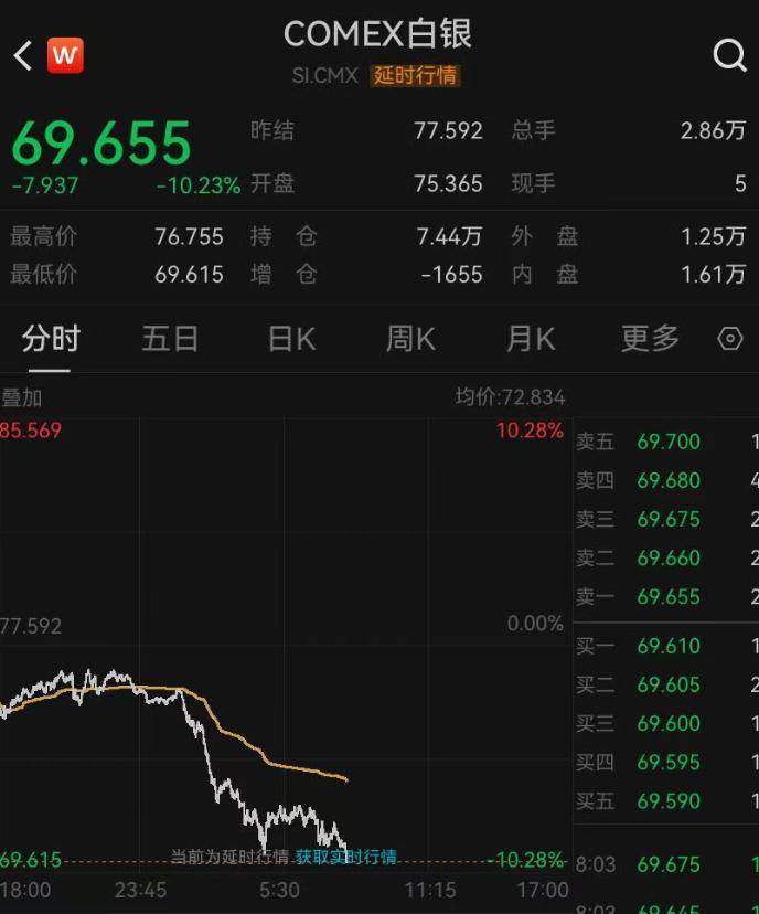 首页 > 资讯 黄金、白银大跳水!白银期货“崩盘”,跌超10% 记者 | 杜宇编辑 | 何小桃 杜恒峰 校对 | 段炼3 月 19 日晚间,黄金、白银价格大跳水。截至发稿,现货黄金日内跌幅扩大至 4.07%,报 4617.46 美元 / 盎司。现货白银日内跌幅扩大至 8.43%,报 69.02 美元 / 盎司。白银期货 " 崩盘 ",COMEX 白银期货跌超 10%,现报 69.65 美元 / 盎司。(免责声明:本文内容与数据仅供参考,不构成投资建议,使用前请核实。据此操作,风险自担。)
