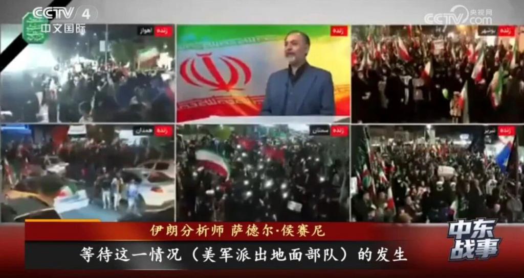 伊朗分析师 萨德尔 · 侯赛尼:我们现在甚至是在按日倒数,等待这一情况(美军派出地面部队)的发生,针对这一问题,已经制定了相当重要的方案。近一段时间以来,美国方面没有出现被俘人员,而我们的战士已经为此做好了准备,并且制定了专门的计划。