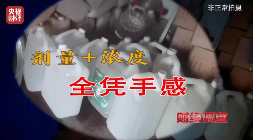 工人手中的这些液体瓶上写着“鱼护宝”,鱼用安定剂,成分丁香酚,属无生产日期、无生产厂家、无生产许可证的“三无”产品。