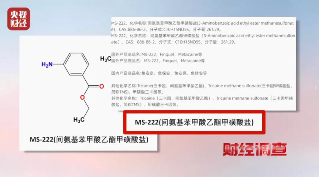 商户向记者展示的 MS-222,俗称甲盐,化学名间氨基苯甲酸乙酯甲磺酸盐,为白色结晶粉末,对鱼类有麻醉作用。