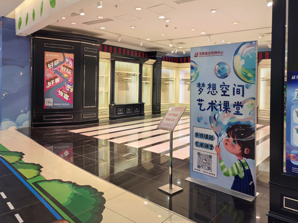 嘉定百联购物中心开业近十年,总建筑面积13.8万平方米,辐射周边近32万常住人口。研究员在商场没有看到明确的名叫“百联艺术嘉”的空间,但在亲子功能最多的3层可以看到不同内容的艺术空间,部分处于“换展”的空窗期,不过都未影响到教培、儿童娱乐、运动店铺的人气。