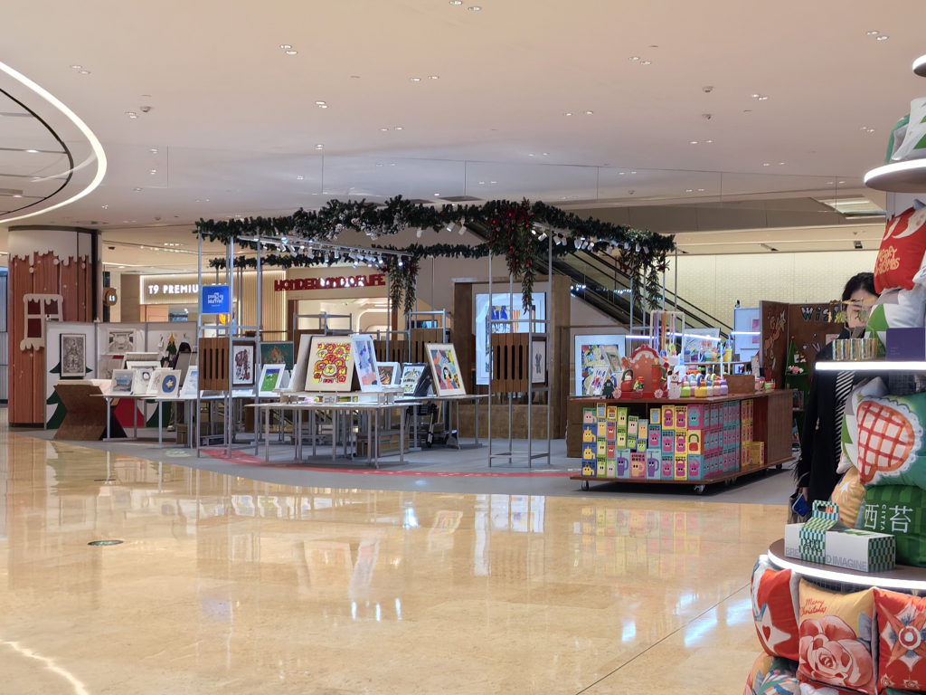 另一种由综合体运营方主导,例如浦东世纪汇广场“Wonderland of life 绮遇之境”在一楼侧厅的“晚安好梦”快闪店,出售的物品从丝巾、手账本到版画,甚至还有与V&A美术馆联名的画作印刷品。由于版画的量很大,相对于依赖文创潮玩的“商业感”而言更具“艺术感”。产品的价位在50-500元之间,符合商场主要消费者的接受度,与周边户外服饰店的受众也有重合。