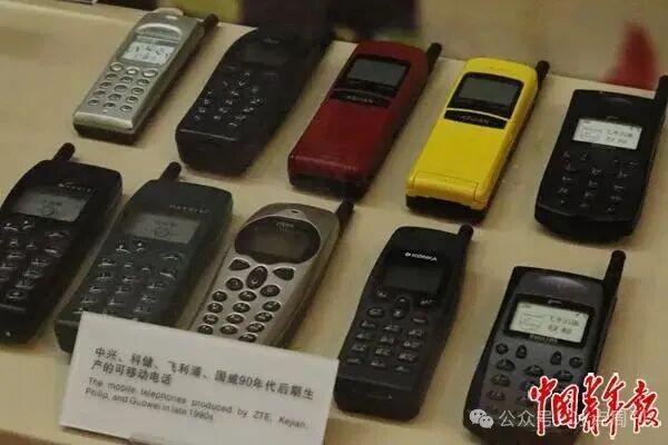 展柜里 20 世纪 90 年代后期生产的可移动电话