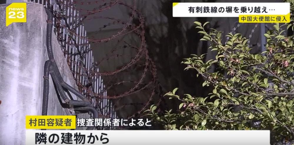 · 大使馆院墙上的有刺铁丝网。(东京广播公司新闻画面截图)