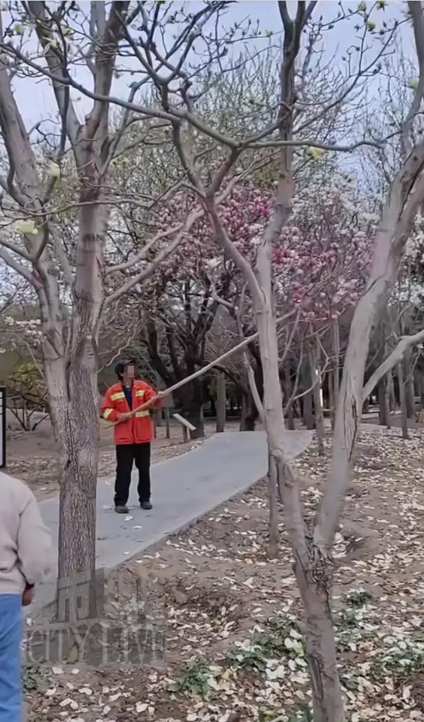 3 月 29 日,有网友发布视频称,在北京市兴隆郊野公园内,一位身着印有 " 景观兴隆 " 制服的工作人员手持竹竿,打落树上正盛开的花朵。