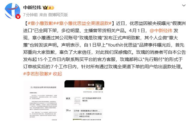 近日,优思益因被央视曝光 " 假澳洲进口 " 已全网下架,多位明星、主播曾带货相关产品。4 月 1 日,据中新经纬,章小蕙通过其公司账号 " 玫瑰是玫瑰 " 发布正式声明致歉,其个人企微 " 章大蕙 " 也转发该声明。声明表示,自 1 日早上 "Youthit 优思益 " 品牌事件曝光后,首先郑重向大家致歉,辜负了大家信任,对此我们深感愧疚。玫瑰的消费者可自本公告发布起 15 个工作日内联系购买平台的官方客服,玫瑰都将以 " 先行赔付 " 的形式于订单核实后的 7 个工作日内,针对所有通过玫瑰全渠道下单的用户给出退款处理。