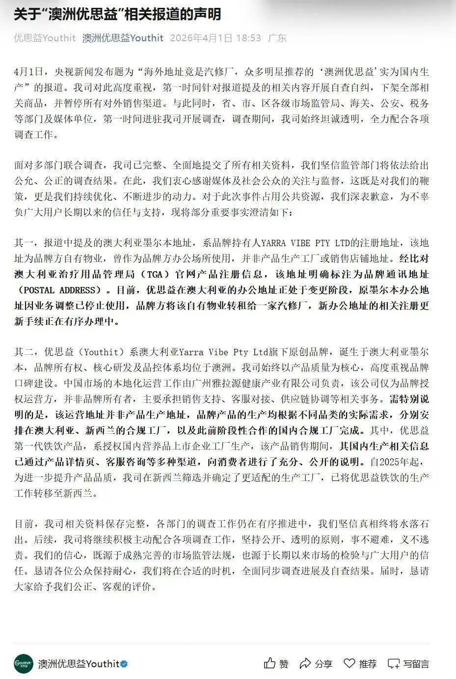 该品牌仍强调,优思益(Youthit)系澳大利亚 Yarra Vibe Pty Ltd 旗下原创品牌,诞生于澳大利亚墨尔本,品牌所有权、核心研发及品控体系均位于澳洲。" 目前,我司相关资料保存完整,各部门的调查工作仍在有序推进中,我们坚信真相终将水落石出。"