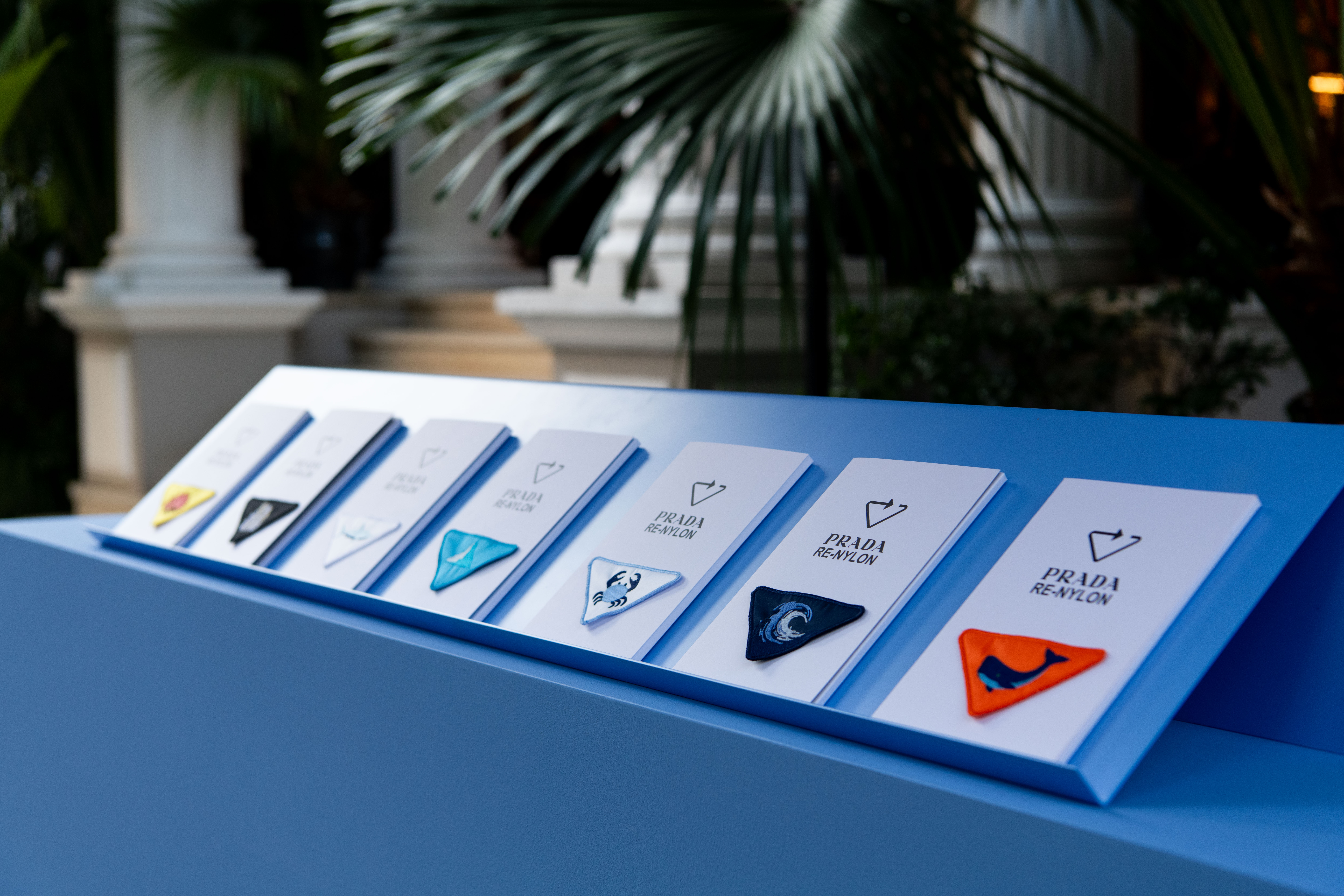 公众在此领取限定赠礼,内含专为SEA BEYOND特别制作的《国家地理》意大利版特刊。每份赠礼均附赠一枚专属刺绣布面徽章,其设计呼应经典Prada三角形标识,共推出七款创意设计,既呼应世界七大洲,亦喻指 “七大洋”。