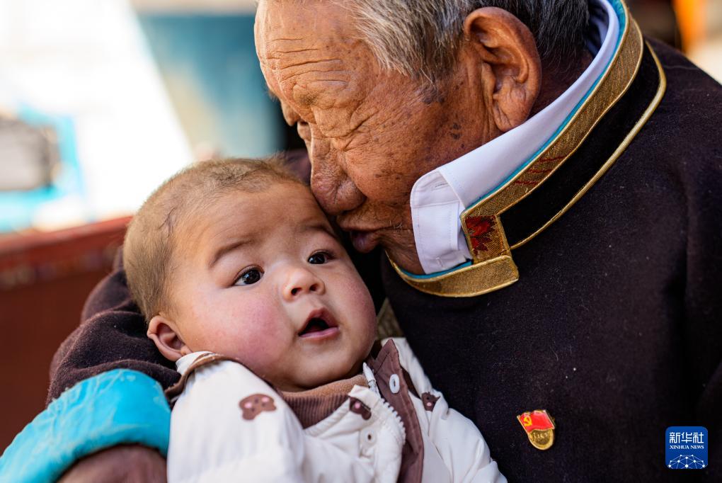 次仁桑珠在西藏山南市扎囊县桑耶镇的家中亲吻曾孙(3 月 25 日摄)。